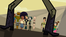 Owen fans a palm leaf for Justin, who asks him to go faster. DJ, panting under the sun, sits inside a small inflatable pool, and Duncan is sitting in the other bench with his feet inside a bucket of water. Gwen and Trent are sitting under the shadow of a tree, and Gwen manages to develop a cold, prompting Trent to try and cheer her up, and he lets her drink from his water bottle. Unfortunately, he makes things awkward when he incorporates his obsession of the number nine by wiping off his water bottle nine times after she drinks from it.