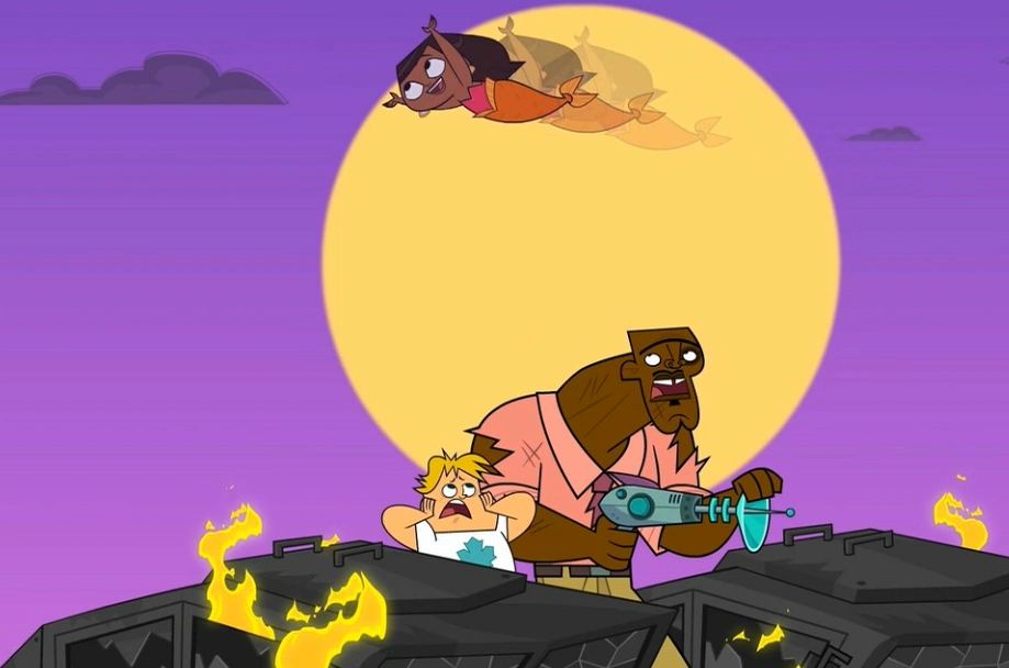 - Leshawna being launched from the red wagon (after it hits a snail) to fly overtop Chef and Owen (standing on a crashed jeep) to escape to the ocean resembles the iconic cover scene in the 1993 film "Free Willy" where Willy jumps over Jesse (standing atop a breakwater) to escape to the ocean, except Leshawna falls short and needs to crawl the rest of the way