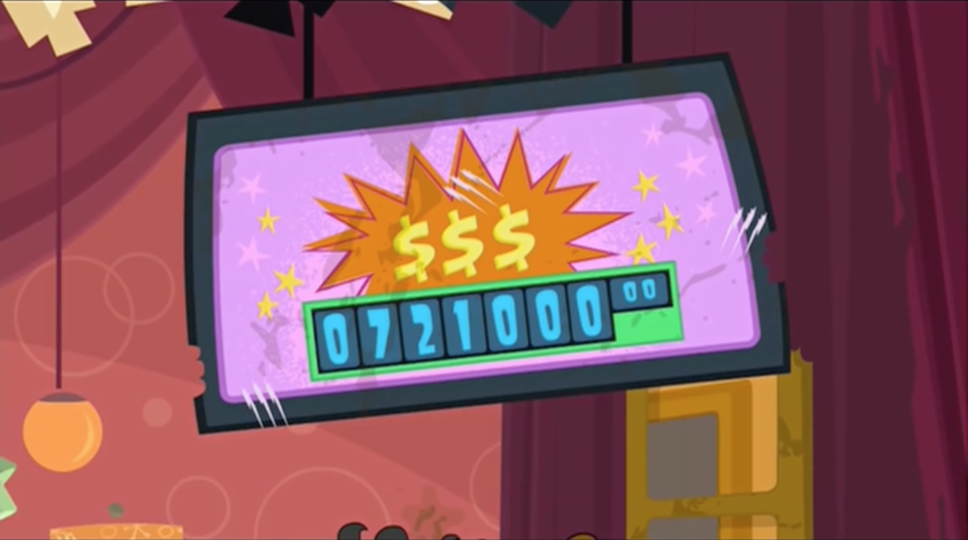 In a final attempt to receive donations, Izzy is brought out, although she will only respond to the name "Brainzilla" due to her newly-awakened intelligence. Izzy refers to herself in the third person and speaks in a sophisticated fashion, referring to Geoff and Bridgette as "carbon-based life forms, commonly referred to as Geoffrey" or "carbon-based life forms, commonly referred to as Bridgette." She also states that Geoff's grammar is appalling. The peanut gallery mysteriously disappears after her entrance, though Geoff says that he has it all under control. Izzy is strapped to a large trivia wheel and will be asked questions based on the amount of money donated; the more money donated, the harder the questions. If Izzy gets a question wrong, she will fall into a pool of sharks. Despite the questions becoming increasingly difficult, Izzy answers them all easily. After the third spin, though, the wheel breaks off and spins offstage, where Izzy suffers another blow to the head.