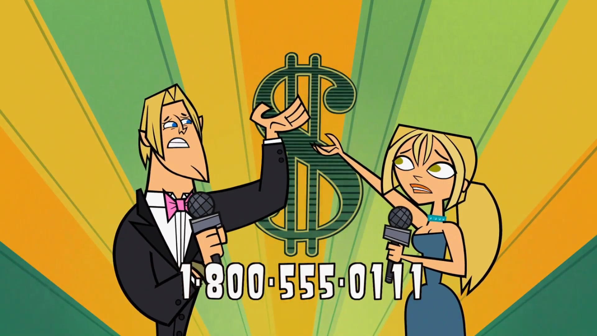 With the Total Drama Jumbo Jet still out of fuel from the last episode, the Total Drama World Tour Aftermath show is turned into a telethon to raise money to refuel the plane and get the cast to their next destination. Bridgette reprises her role as co-host along with Geoff, while Blaineley has been demoted to roving reporter and covers the fundraiser. $500,000 is needed to fuel the plane, as explained in Bridgette and Geoff's duet, "Save This Show". Despite their moving duet, no money is raised at first. Some incentives are then offered, including a box of Chef Hatchet's Total Drama Yum Yum Happy Go Time Candy Fish Tails for a $25 donation, a T-shirt with Chris' face on it that shrinks and bleeds when wet for a $50 donation, and one of Lindsay's unused tubes of lip gloss for a $100 donation. Still, they only raise $203, $200 of which came from Harold's mother when Harold promised to clean out their garage.