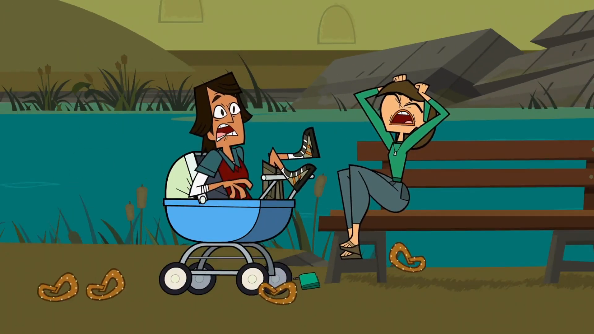 Tyler reaches the end, and Alejandro grabs the apple. Tyler, exhausted, sinks into the water, but Owen pulls him back up. Team Chris Is Really Really Really Really Hot runs to the finish line, and DJ gets out of the water. He gives Lindsay the apple and notices a snapping turtle biting the back of his shorts. He takes it off and tosses it in the water, but a larger snapping turtle surfaces and eats it. DJ is saddened, but Leshawna mocks him and tells him to get to the finish line with them. Sierra walks towards the carriage and tosses the apple off of her head on Cody, and Team Amazon runs to the finish line.
