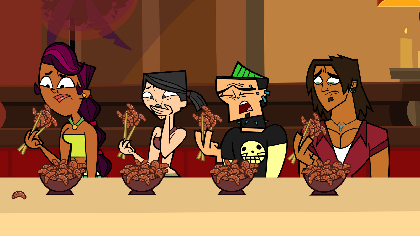 Blaineley, being allied with Chef, is served slightly different food (that is actually edible) than the other contestants. Throughout the challenge, the contestants have to sing a song. Cody is eliminated when he thinks that the donkey meat served first is his new friend Ace, the donkey. Heather is then eliminated when she finishes the next food item last and vomits at Chris's face. Then Duncan is eliminated when Sierra beats him in finishing a starfish as he spits a chuck out.