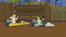 Chris then brings a restrained Duncan to demonstrate the challenge, but he runs to the forest once Chef sets him free. Chris gives the instructions of the challenge: the contestants must find the hidden keys in the kitchen to Chef's vintage go-karts and then drive them to three different landmarks and leave their mark in them. First to finish wins. Chef scolds Chris for letting the contestants drive his kart collection, but Chris ignores him.