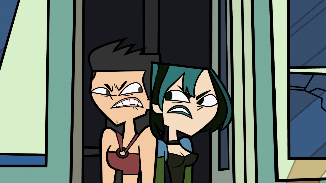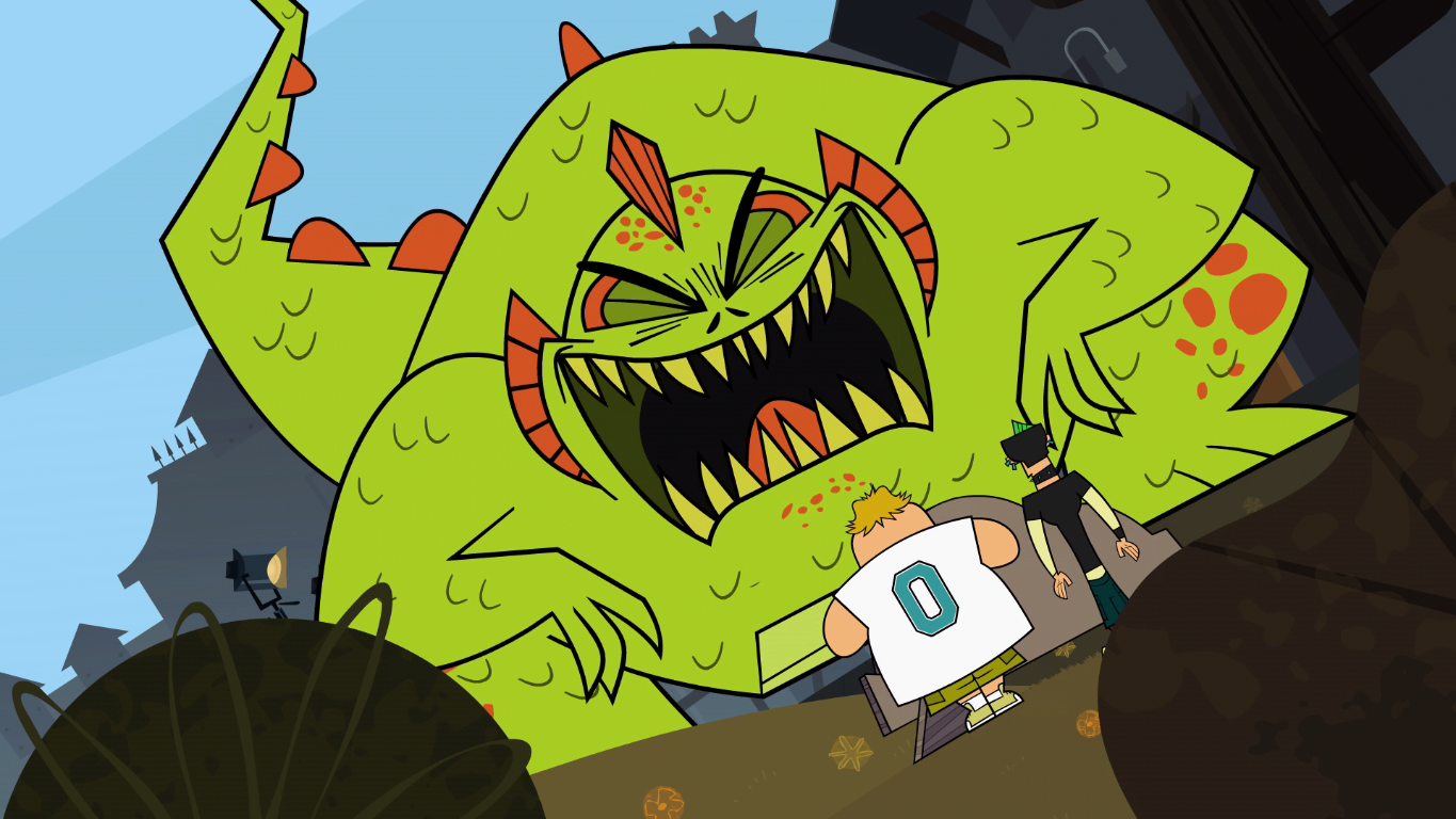 - When the monster is dropping Justin into the bounce house, the shapes of Gwen and Trent are visible on the right side, but it is supposed to be Bridgette and Geoff there, as shown in the next shot, where everyone is staring at Justin. This also happens when Harold and Leshawna are put in.