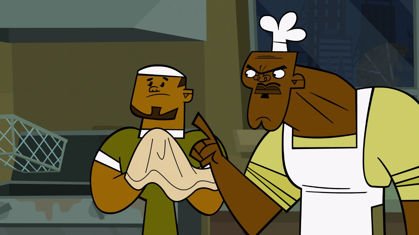 The Screaming Gaffers, besides DJ, who is still with Chef, are shown in the dining hall, also studying and eating. Duncan is shown doing more eating than studying, claiming that the pizza is "rad," while Harold questions whether Leshawna is going to have any of the pizza.