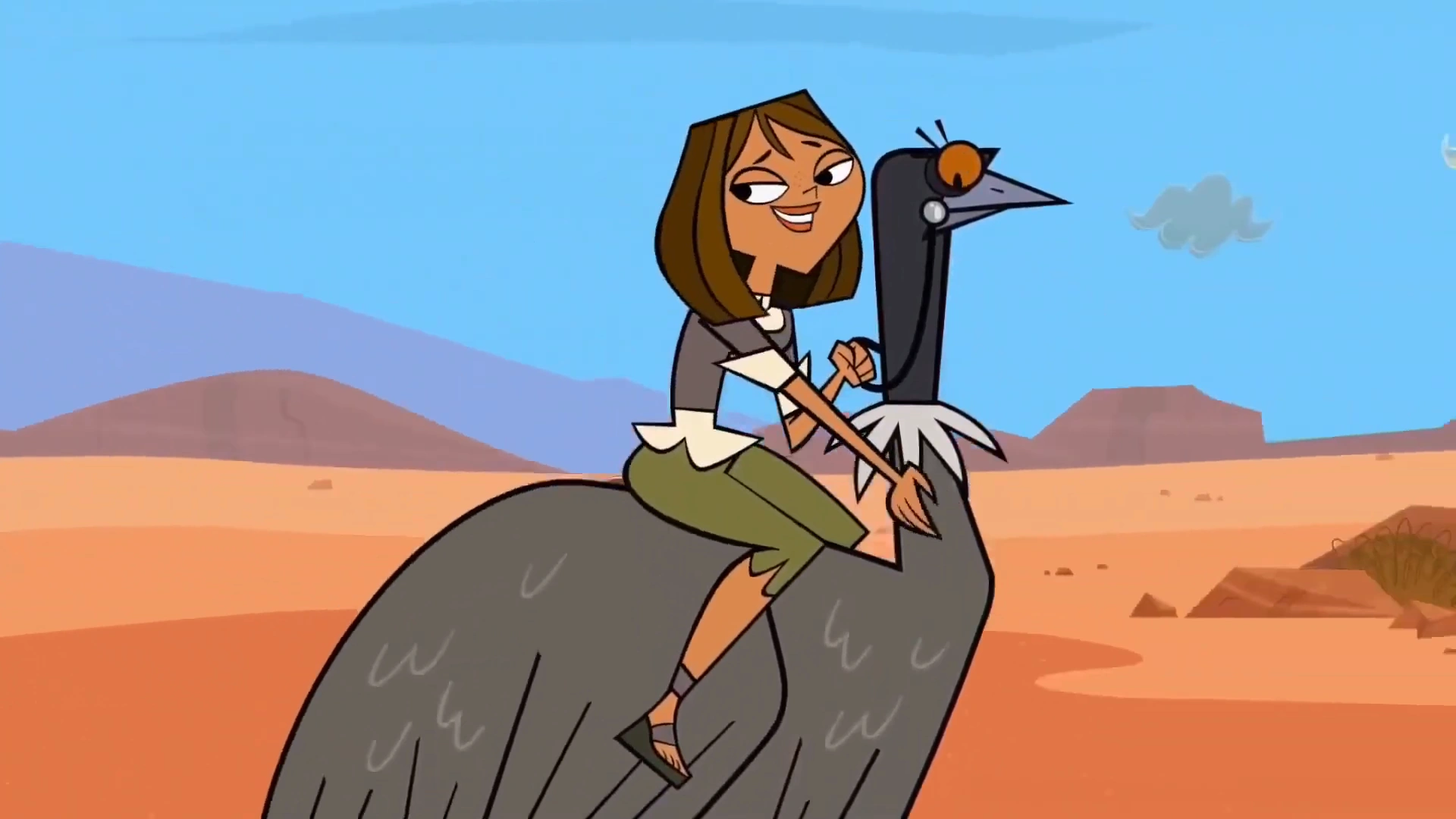 Gwen walks besides Duncan, asking her what's with Heather, whom she thinks she just realized Duncan is alive, to which Duncan says she's probably plotting to kill him. Duncan finally mounts his emu but is almost thrown off as Cody knocks him over as he passes by, Duncan yells at Cody angrily, but Cody only blows a raspberry in response. Heather tells Courtney to speed up the pace, but Courtney claims it is the fault of the emu, which Heather says she should command it, as it has the brain of walnut.Courtney then goes on to ask if Alejandro and Heather are a "thing," to which Heather scoffs and says that he wishes. Alejandro then approaches them, flirting with Courtney by telling her that her emu is the luckiest creature on the planet for being able to carry her. Courtney asks Heather if Duncan saw her talking to Alejandro. Heather, irritated, says Duncan is possibly the only one who missed it, and then she tells Courtney to hurry up again.