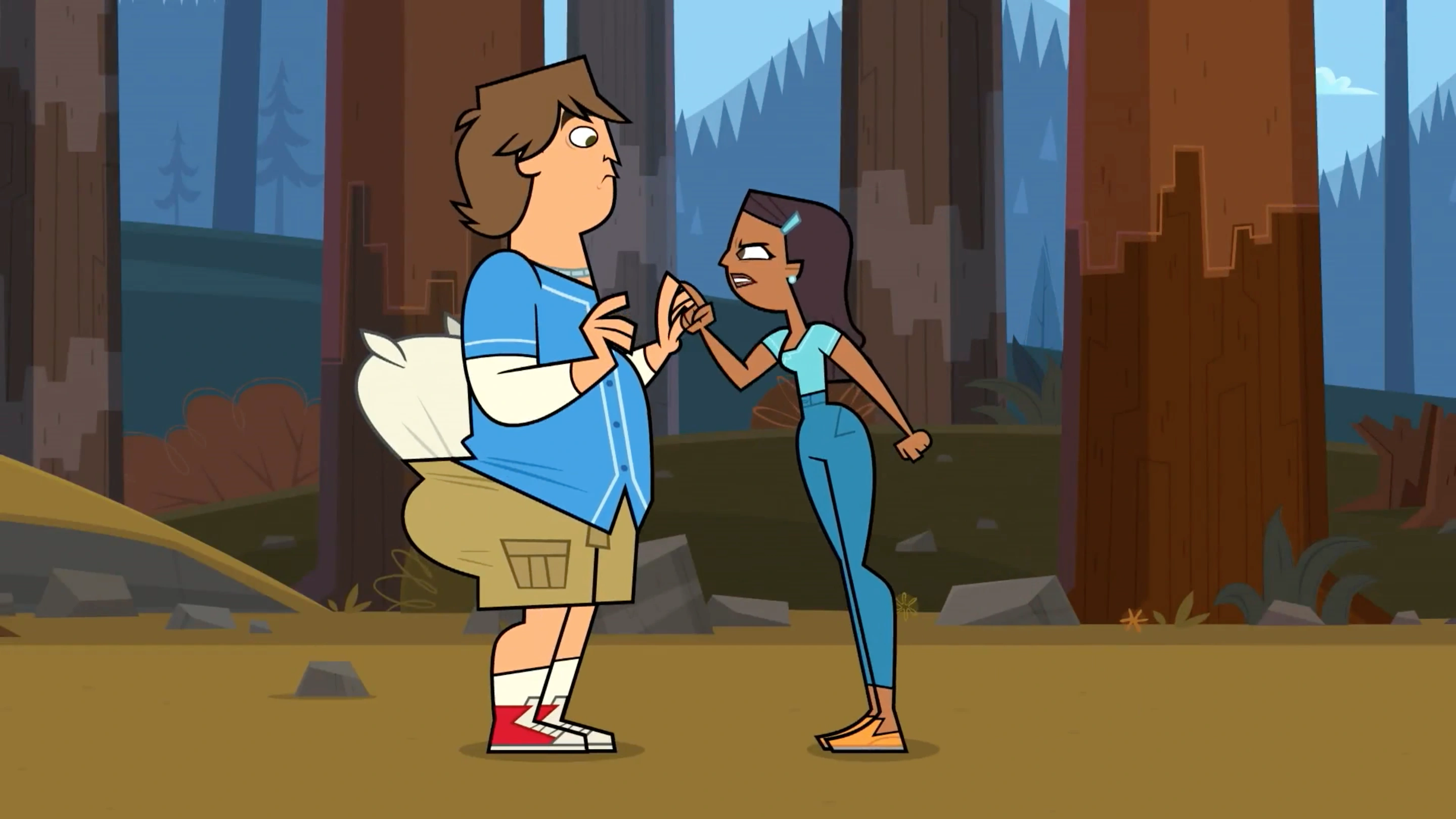A year later, Ripper has developed a crush on Axel, with it going unrequited because of her still holding a grudge against him because of last season. Ripper starts trying to impress Axel after Taking It to the Rim Reaper, desiring to prove he’s the “Coolest guy ever.” He fails to make her swoon over him, embarrassing himself instead. After finding out that Axel likes poetry in Choosin' for a Bruisin', Ripper had initiated a plan to win her over, succeeding this time and sharing his first kiss with Axel at the episode’s campfire ceremony. From this episode onwards, the two become a couple. And they are primarily seen making out. Up until Fun Fight at the O'Cake Corral, they’d been a pretty affectionate couple, disgusting everyone else with this. This unfortunately ends with Axel getting voted off. In an act of refusal to be without her, Ripper grabs onto her legs as she once again takes the Drone of Despair: quitting the game to be with her.