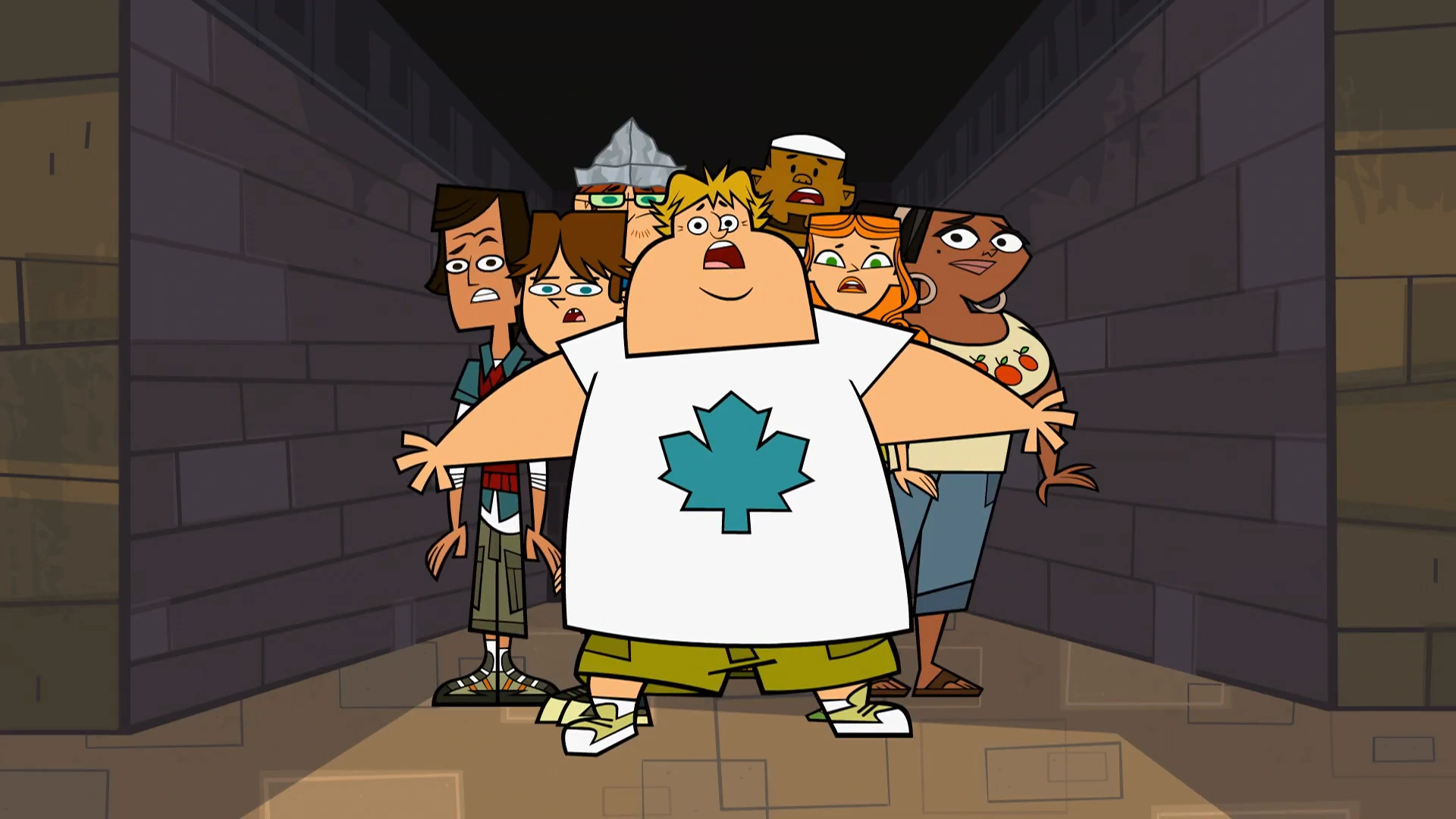 Cody, DJ, Harold, Izzy, Leshawna, Noah, and Owen gasp when they see three paths in the pyramid.